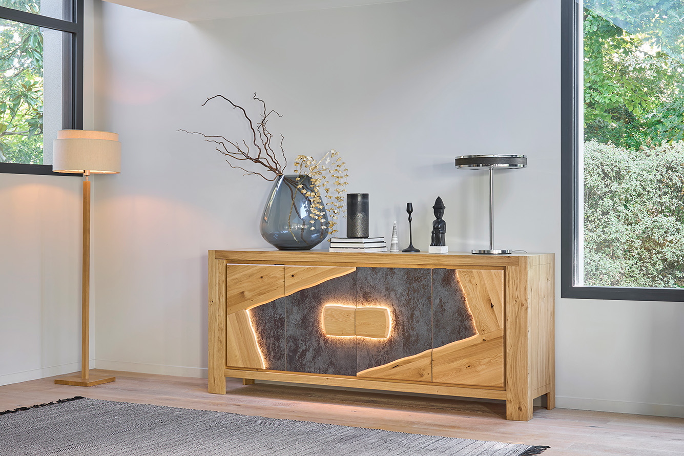 - Portes battantes : Chêne massif + céramique collée sur panneau de MDF revêtus de véritable bois placage chêne