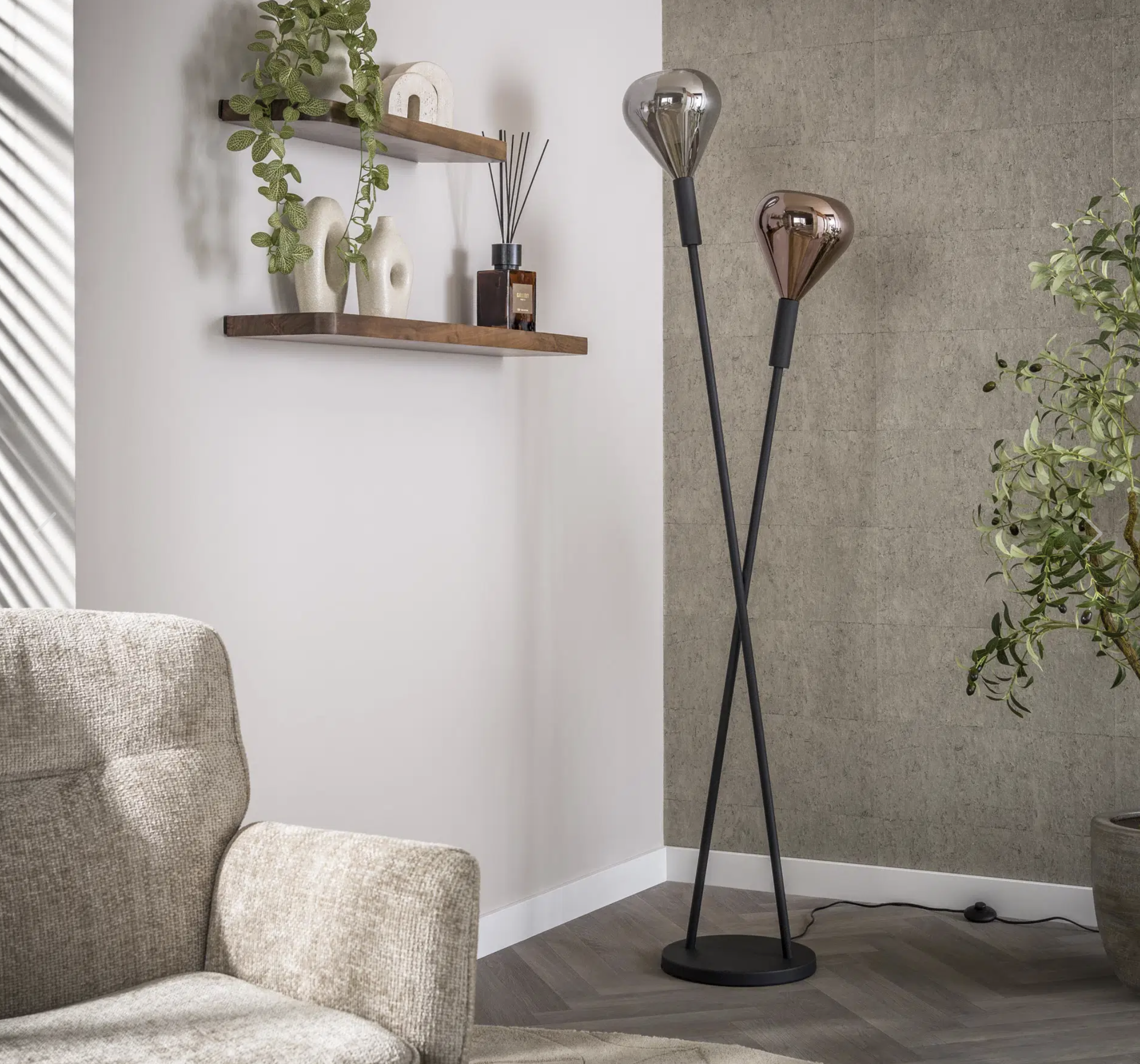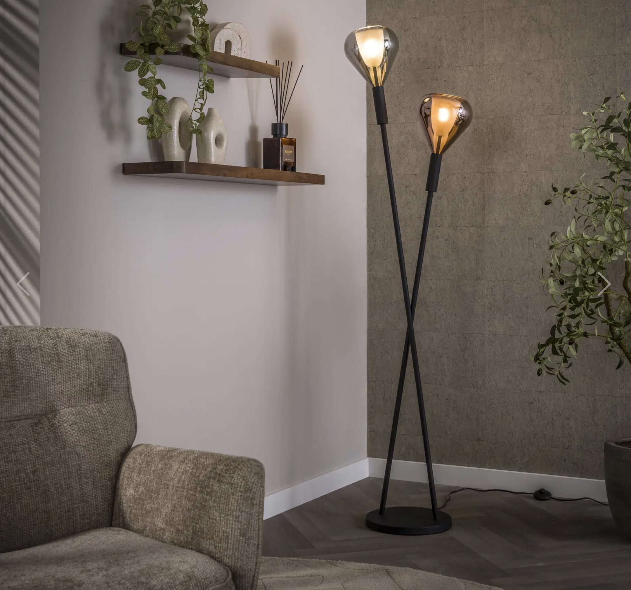 Lampadaire FRAME en métal noir avec deux abat-jour en verre en forme de goutte, finition cuivrée et chromée à l’intérieur sablé.