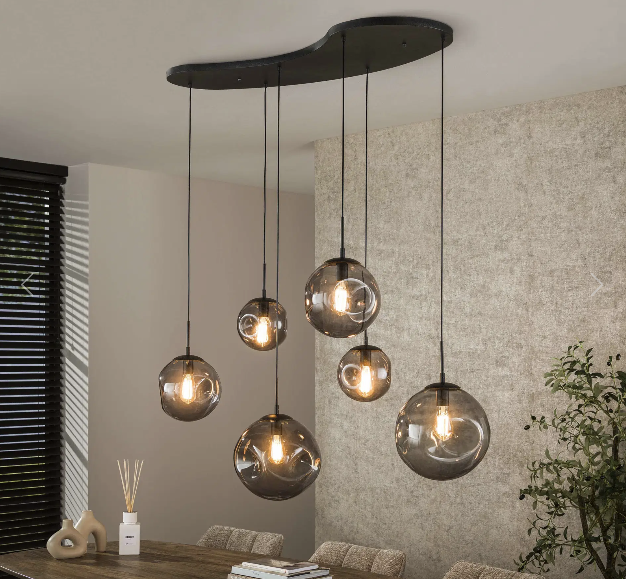 La suspension Olympo se distingue par ses six abat-jours en verre suspendus à une base de plafond au design organique.