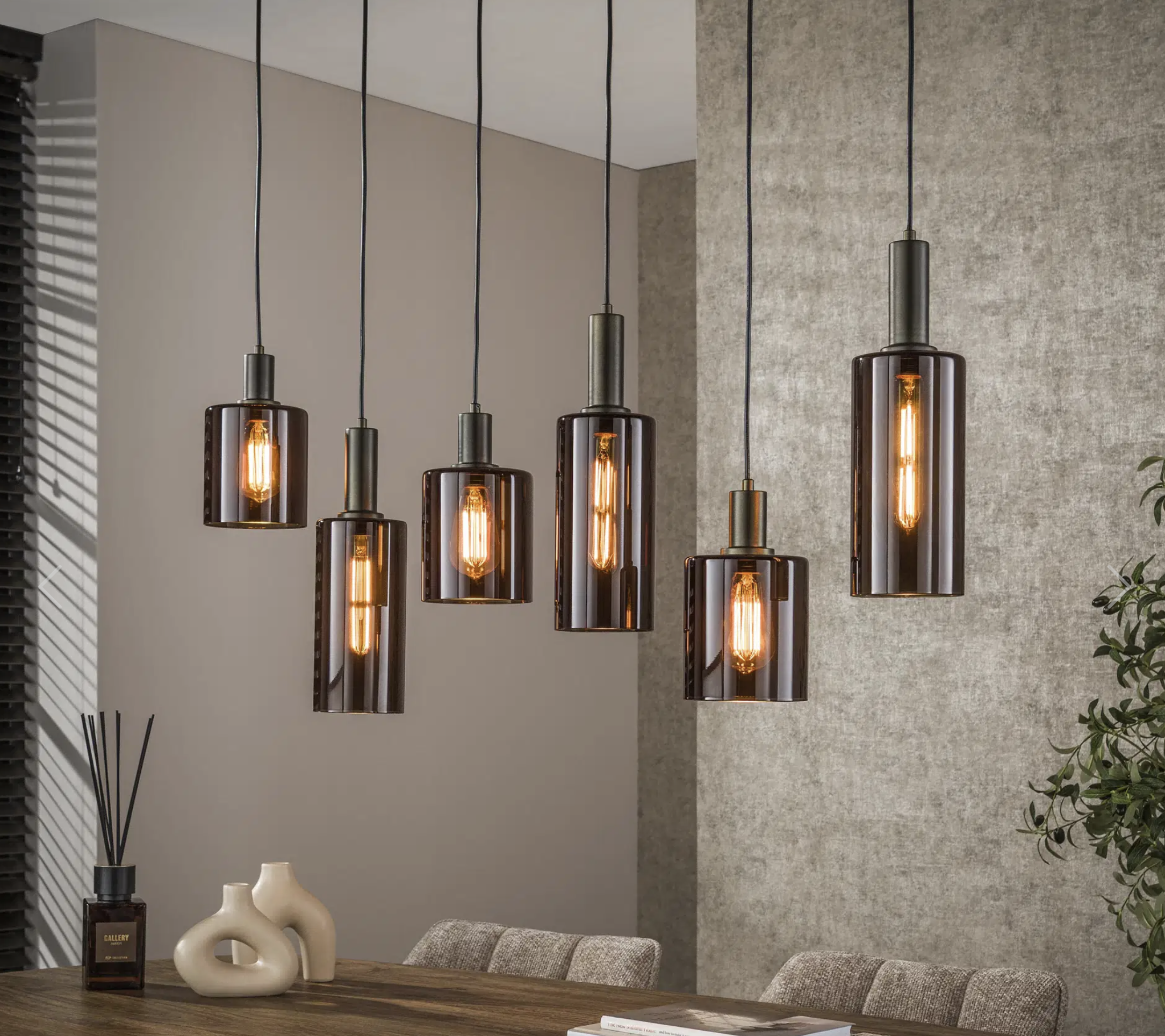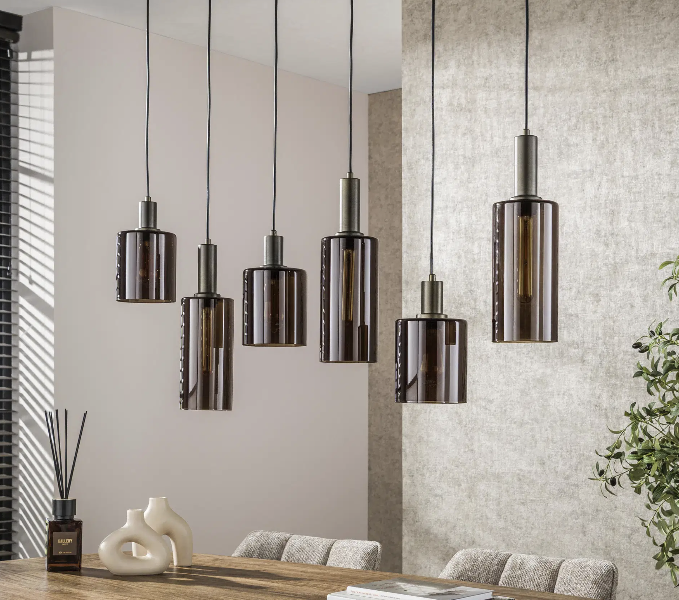 Suspensions NOYER 6 lumières avec monture métallique finition bronze et abat-jour cylindriques en verre de deux tailles.
